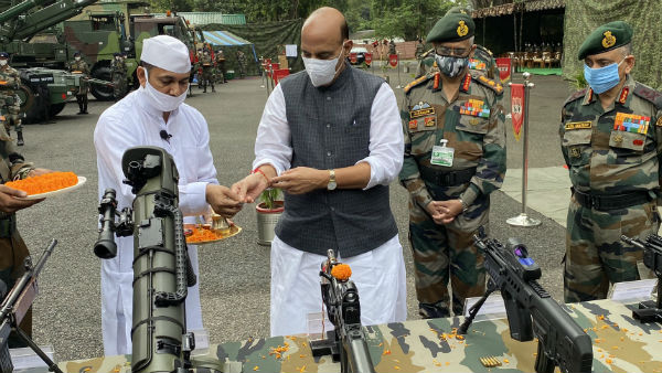 ഒരിഞ്ച് ഭൂമിയിൽ പോലും തൊടാൻ സൈന്യം അനുവദിക്കില്ല; അതിർത്തിയിൽ ശസ്ത്ര പൂജ നടത്തി പ്രതിരോധമന്ത്രി