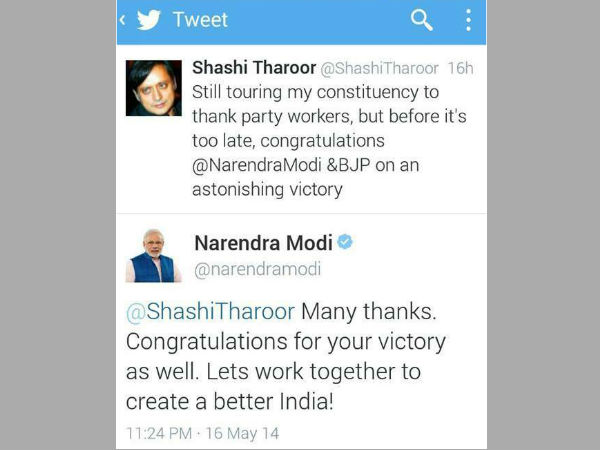 ട്വിറ്റര് വഴിയായിരുന്നു അഭിനന്ദനം അറിയിക്കലും മറുപടി കൊടുക്കലും ഒക്കെ. പലപ്പോഴും മോദിക്കെതിരെ തരൂരും തരൂരിനെതിരെ മോദിയും ട്വിറ്റര് പരാമര്ശങ്ങള് മുമ്പ് നടത്തിയിരുന്നു.