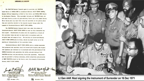 കിഴക്കന് പാക്കിസ്ഥാനിലെ (ഇപ്പോള് ബംഗ്ലാദേശ്) പാകിസ്ഥാന് ആര്മി കമാന്ഡറായ ലഫ്റ്റനന്റ് ജനറല് എഎകെ നിയാസി, ഇന്ത്യയുടെ കിഴക്കന് ആര്മി കമാന്ഡര് ലഫ്റ്റനന്റ് ജനറല് ജഗ്ജിത് സിംഗ് അറോറയ്ക്ക് മുന്നില് കീഴടങ്ങാന് സമ്മതിച്ചു. ഡിസംബര് 16 ന് വൈകുന്നേരം ജനറല് നിയാസി കീഴടങ്ങല് രേഖകള് സ്വീകരിച്ചു, ഇതോടെ യുദ്ധം ഇന്ത്യ ഔദ്യോഗികമായി വിജയിച്ചു. അതുകൊണ്ടാണ് ഈ ദിനം വിജയ് ദിവസ് എന്നറിയപ്പെടുന്നത്, എല്ലാ വര്ഷവും ഇത് അനുസ്മരിക്കുന്നു.