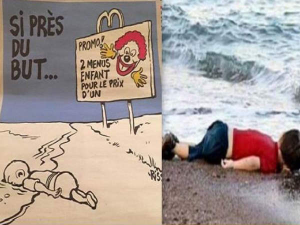 ഒരു മക്ഡൊണാള്ഡ് പരസ്യവും അയ്ലന്റെ മൃതദേഹത്തിന്റെ രേഖാചിത്രവും ആണ് ആദ്യ കാര്ട്ടൂണില് ഉള്ളത്. ഒന്നിന്റെ വിലയ്ക്ക് രണ്ട് കുട്ടികള് എന്നാണ് പരസ്യവാചകം.