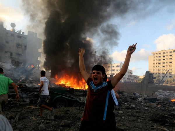 ഗാസയില് ഇസ്രായേലിന്റെ ഷെല് ആക്രമണത്തില് തകര്ന്ന കെട്ടിടത്തിന് മുന്നില് രോഷത്തോടെ ആക്രോശിക്കുന്ന പലസ്തീന് പൗരന്.