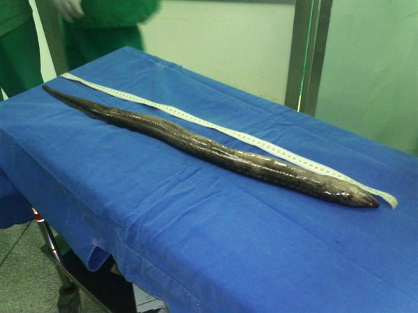 വല്ല നെത്തോലിയും ആണ് വയറ്റില് ഉണ്ടായിരുന്നതെന്ന് കരുതരുതേ. സൗത്ത് അമേരിയ്ക്കന് ലങ്ഫിഷ് ആണ്. ഇതൊരു കുഞ്ഞന് മീനൊന്നും അല്ല കേട്ടോ. നമ്മുടെ നാട്ടില് വാളയെന്നും തളയെന്നും ഒക്കെ അറിയപ്പെടുന്ന മീനുമായി സാമ്യമുള്ളതാണ് ലങ്ഫിഷ്.ഏകദേശം 125 സെന്റീമീറ്റര് നീളമുണ്ട്. പുറത്തെടുത്ത ശേഷം മത്സ്യം ചത്തു. ഡെയ്ലി മെയില് ആണ് വാര്ത്ത റിപ്പോര്ട്ട് ചെയ്യുന്നത്.