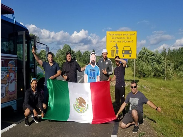 കട്ടൗട്ടിൽ `ഇവിടേക്ക് വരാൻ ഭാര്യ എന്നെ അനുവദിച്ചില്ല' എന്നെഴുതിയ ടീഷർട്ടും ഇട്ടായിരുന്നു ഇവർ റഷ്യയിലേക്ക് കൊണ്ടുപോയത്. യാത്രയുടെ തുടക്കത്തിൽ എടുത്ത ഫോട്ടോയിൽ മുതൽ മടക്കയാത്രയിലെ ചിത്രത്തിൽവരെ ഇവർ കൂട്ടുകാരൻരെ കട്ടൗട്ട് ചേർത്ത് പിടിച്ചിട്ടുണ്ട് ഇൗ മെക്സിക്കൻ സംഘം.