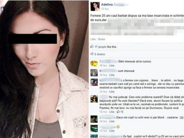 ഇത്തരത്തില് കഴിഞ്ഞദിവസം ഫേസ്ബുക്കില് പ്രത്യക്ഷപ്പെട്ട ഒരു പരസ്യം ഏവരെയും അമ്പരപ്പിച്ചിരിക്കുകയാണ്. ഗര്ഭിണിയാക്കാന് ആളെ ആവശ്യമുണ്ടെന്ന തരത്തില് ഒരു റൊമാനിയന് യുവതിയായിരുന്നു ഫേസ്ബുക്കില് പരസ്യം നല്കിയത്. വെറുതെയല്ല, 350 പൗണ്ട് പ്രതിഫലവും ഇരുപത്തിയഞ്ചുകാരിയായ അദേലിന അല്ദു എന്ന യുവതി വാഗ്ദാനം ചെയ്യുന്നുണ്ട്.