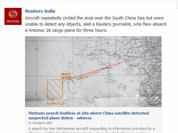 രണ്ട് വിയറ്റ്നാം വിമാനങ്ങള് ആണ് ചൈന നല്കിയ വിവരപ്രകാരം തിരച്ചില് നടത്തിയത്. പക്ഷേ ഇവര്ക്ക് വിമാനത്തിന്റെ അവശിഷ്ടങ്ങളൊന്നും കണ്ടെത്താനായില്ല. തിരച്ചില് സംഘത്തോടൊപ്പം ഉണ്ടായിരുന്ന റോ്റ്റേഴ്സ് ന്യൂസ് ഏജന്സി ലേഖകനാണ് ഇക്കാര്യം പുറത്ത് വിട്ടത്.