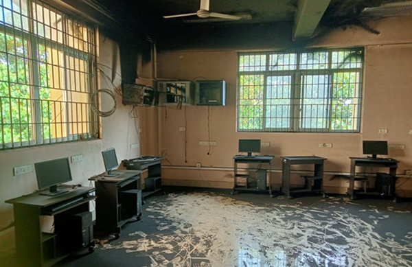 ക്രിസ്തുമസ് അവധിയായതിനാല് കംപ്യൂട്ടര് ലാബ്് അടച്ചിട്ടിരിക്കുകയായിരുന്നു. കണ്ണൂര് സര്വകലാശാല ധര്മശാല സ്കൂള് ഓഫ് പെഡഗോളജിക്കല് സയന്സിന്റെ (ബി. എഡ് കോളേജ്) ലാബിലാണ് വന്തീപിടിത്തമുണ്ടായത്. ഇന്റര്നെറ്റ് സാമഗ്രികളും കംപ്യൂട്ടറുകളുമാണ് കത്തിനശിച്ചത്. നെറ്റ് വര്ക്ക് സ്വിച്ചു ബോര്ഡിലുണ്ടായ ഷോര്ട്ട് സര്ക്യൂട്ടാണ് തീപിടിത്തത്തിന് കാരണമാണെന്നാണ് പൊലിസിന്റെ പ്രാഥമിക നിഗമനം. വെള്ളിയാഴ്ച്ച രാവിലെ പതിനൊന്നരയോടെയാണ് തീപിടിത്തമുണ്ടായത്.