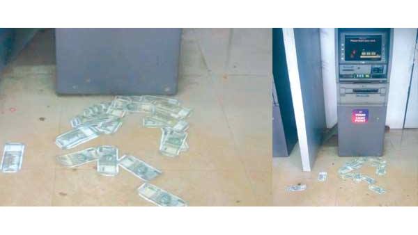 കണ്ണൂര് ടൗണ് പോലീസ് സംഭവസ്ഥലത്തെത്തി പണം കസ്റ്റഡിയിലെടുത്ത് ബാങ്ക് ഉദ്യോഗസ്ഥരെ വിളിച്ചുവരുത്തി പണം കൈമാറുകയും ചെയ്തു. അഞ്ഞൂറിന്റെ 20,000 രൂപയായിരുന്നു ചിതറിക്കിടന്നിരുന്നത്.നേരത്തെ കണ്ണൂര്-കാസര്കോട് ദേശീയപാതയിലെ പിലാത്തറയില് എ.ടി. എമ്മില് നിന്നും പണം പുറത്തുവരാത്തതിനെ തുടര്ന്ന് രോഷാകൂലനായ യുവാവ് മെഷിന് കല്ലുക്കൊണ്ടു ഇടിച്ചു തകര്ത്തിരുന്നു.ഇയാള് പണാപഹരണക്കേസില് ഇപ്പോള് റിമാന്ഡിലാണ്. എന്നാല് സ്വന്തം അക്കൗണ്ടില് നിന്നും ആവശ്യപ്പെട്ട പണം മുഴുവനായി ലഭിക്കാത്തതാണ് ഇയാളെ പ്രകോപിതനാക്കിയതെന്നാണ് വിവരം. മിക്ക എ.ടി. എം കൗണ്ടറുകളും കാവല്ക്കാരില്ലാതെയാണ് പ്രവര്ത്തിക്കുന്നത്. ഇതും എ.ടി. എം കൗണ്ടറുകള് തകര്ത്തു മോഷണം നടത്താന് കവര്ച്ചക്കാരെ പ്രേരിപ്പിക്കുന്നുണ്ട്.