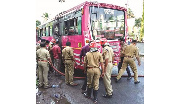 ബസ്സില് തീപിടിച്ച വിവരമറിഞ്ഞ് ട്രാഫിക് പോലീസും സ്ഥലത്ത് കുതിച്ചെത്തി വാഹനഗതാഗതം നിയന്ത്രിച്ചു. ഒമ്പതരയോടെയാണ് തീ പൂര്ണ്ണമായും അണച്ചത്. ഡീസല് ടാങ്ക് ഭാഗത്തേക്ക് തീ പടരാതിരുന്നത് വന് ദുരന്തം ഒഴിവാക്കി. ടയറുകള് അമിതമായി ചൂടായതാണ് ടയര്പൊട്ടാനും തീപിടിത്തത്തിനും കാരണമെന്ന് കരുതുന്നതായി ഫയര് ഫോഴ്സ് അധികൃതര് പറഞ്ഞു.