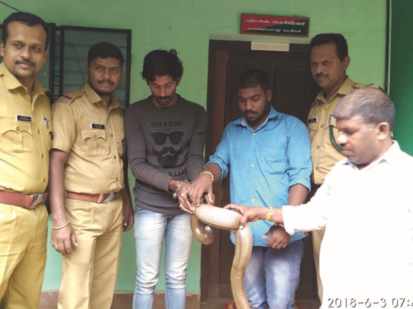 പിടികൂടിയ ഇരുതല പാമ്പുമായി പ്രതികള്.