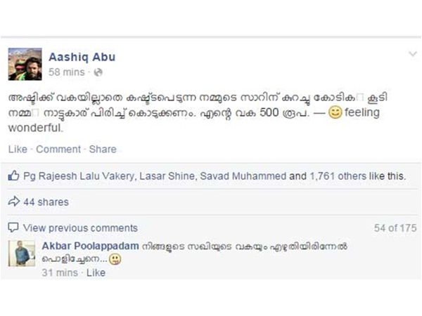 ആഷിക് അബു തന്റെ ഫേസ്ബുക്ക് പേജിലൂടെയാണ് കെഎം മാണിയെ പരിഹസിച്ചത്. അഷ്ടിക്ക് വകയില്ലാതെ കഷ്ടപ്പെടുന്ന നമ്മുടെ മാണി സാറിന് കുറച്ചു കോടികള് കൂടി നമ്മള് നാട്ടുകാര് പിരിച്ച് കൊടുക്കണമെന്നാണ് ആഷിക് പോസ്റ്റ് ചെയ്തിരിക്കുന്നത്. എന്റെ വക 500 രൂപ നല്കാമെന്നും ആഷിക് പറയുന്നുണ്ട്.