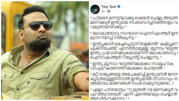 'വീട്ടിൽ കർപ്പൂരവും ഗ്രാമ്പൂവും ഉപയോഗിച്ച് പുക', കൊറോണക്കെതിരെ വിചിത്ര പോസ്റ്റുമായി ടിനി ടോം