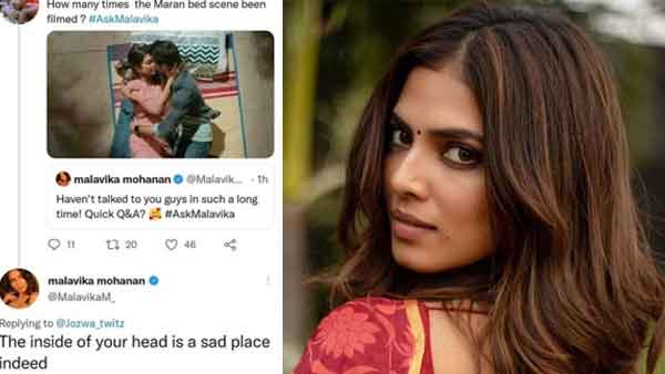 മാളവിക മോഹനന് ഏറ്റവും ഒടുവില് അഭിനയിച്ചത് നടന് ധനുഷ് നായകനായെത്തിയ മാരനാണ്. മാരന് സിനിമയിലെ കിടപ്പറ രംഗത്തെ കുറിച്ചായിരുന്നു ഒരു ട്വിറ്റര് യൂസറുടെ ചോദ്യം. മാരനിലെ കിടപ്പറ രംഗം എത്ര നേരം കൊണ്ടാണ് ഷൂട്ട് ചെയ്തത് എന്നായിരുന്നു ഇയാളുടെ അശ്ലീല ചുവയോടെയുള്ള ചോദ്യം. ഏറ്റവും ദുഃഖം നിറഞ്ഞ സ്ഥലമാണ് നിങ്ങളുടെ തല എന്നായിരുന്നു ഇതിന് മാളവിക മോഹനന് നല്കിയ മറുപടി.