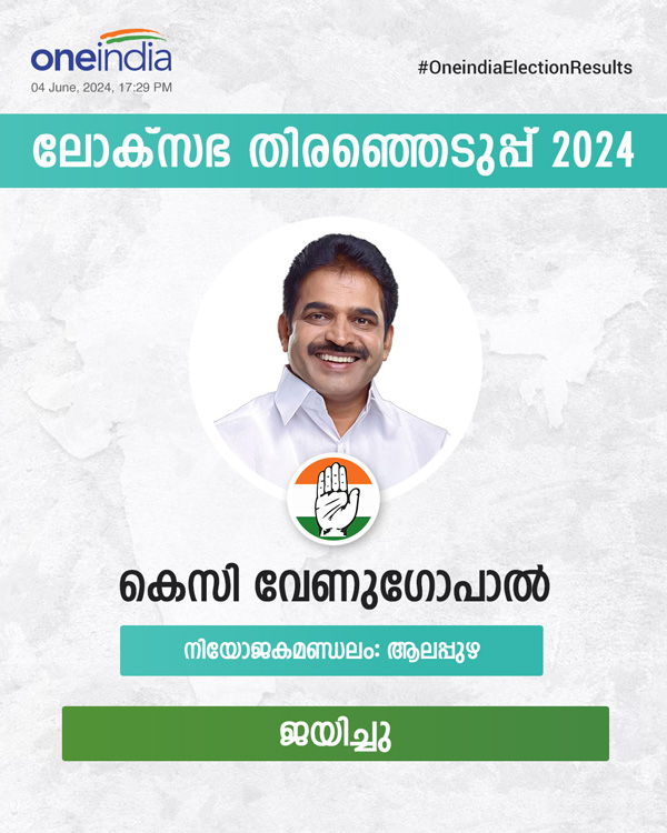 ആലപ്പുഴ മണ്ഡലത്തിൽ കെസി വേണുഗോപാൽ വിജയിച്ചു