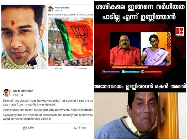 ഇപ്പോള് പുതിയ വിശദീകരണവുമായി രംഗത്തെത്തിയിരിക്കുകയാണ് അമല് ഉണ്ണിത്താന്. തന്റെ അക്കൗണ്ട് കഴിഞ്ഞ ദിവസം ഹാക്ക് ചെയ്യപ്പെട്ടെന്നും ബിജെപിയെ അനുകൂലിച്ച് തന്റെ അക്കൗണ്ടിലൂടെ എത്തിയ പോസ്റ്റ് തന്റെ ശ്രദ്ധയില് പെട്ടതിന് പിന്നാലെ ഡിലീറ്റ് ചെയ്തെന്നുമാണ് അമലിന്റെ വിശദീകരണം. വോട്ടവകാശം പോലും ഇല്ലാത്ത താന് ഏത് പാര്ട്ടിക്കാണ് വോട്ട് ചെയ്യേണ്ടതെന്നും പോസ്റ്റില് ചോദിക്കുന്നു.