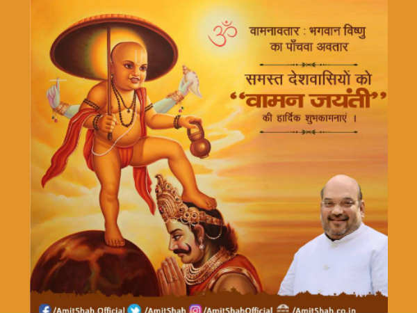 ഇപ്പോഴിതാ ബിജെപി ദേശീയ അധ്യക്ഷന് അമിത് ഷായും വാമന ജയന്തി ആശംസയുമായി രംഗത്തിറങ്ങിയിരിക്കുന്നു. തന്റെ ഫേസ്ബുക്ക് പേജിലൂടെയാണ് അമിത് ഷാ എല്ലാവര്ക്കും വാമന ജയന്തി ആശംസകള് നേര്ന്നിരിക്കുന്നത്.