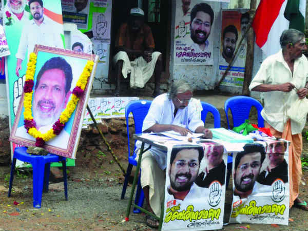 വോട്ടുപിടിയ്ക്കാന് ബൂത്തുകളില് കാര്ത്തികേയന്റെ ചിത്രവുമായി കോണ്ഗ്രസ്