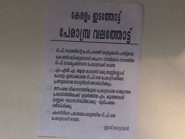 കേരളം ഇടത്തോട്ട്, പേരാമ്പ്ര വലത്തോട്ട് എന്ന തലക്കെട്ടോടുകൂടിയാണ് പോസ്റുകള് പ്രത്യക്ഷപ്പെട്ടിട്ടുള്ളത്. അതായത് ടിപി മത്സരിച്ചാല് പേരാമ്പ്രയില് യുഡിഎഫ് ജയിക്കും അല്ലെങ്കില് തങ്ങള് ജയിപ്പിക്കുമെന്നര്ഥം. സ്ഥാനാര്ഥികള്ക്കെതിരെ പോസ്റ്ററും നോട്ടീസുമൊക്കെ പലയിടത്തും സാധാരണ സംഭവമായിരിക്കാം. എന്നാല്, ഇടതുപക്ഷത്തിന്റെ വടക്കന് കോട്ടകളില് ഇത്തരം വിള്ളലുകള് ആദ്യമായാണെന്നതാണ് രാഷ്ട്രീയ കേരളത്തെ ആശ്ചര്യപ്പെടുത്തുന്നത്.