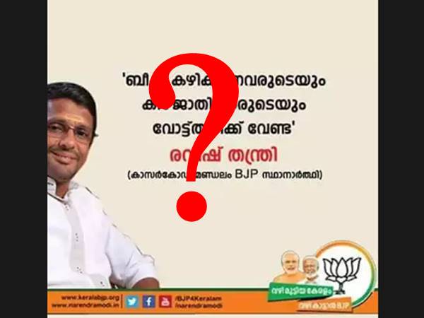 'കീഴ്ജാതിക്കാരുടെ വോട്ട് വേണ്ട'... ബിജെപി സ്ഥാനാര്ഥി രവീശ് തന്ത്രിക്കെതിരെ വ്യാജ പ്രചാരണം..