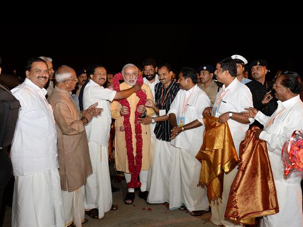 ബിജെപി ദേശീയ സെക്രട്ടറി പികെ കൃഷ്ണദാസ്, സംസ്ഥാന പ്രസിഡന്റ് വി മുരളീധരന്, പിഎസ് ശ്രീധരന് പിള്ള, ഒ രാജഗോപാല് തുടങ്ങിയ നേതാക്കളാണ് മോഡിയെ സ്വീകരിച്ചത്.