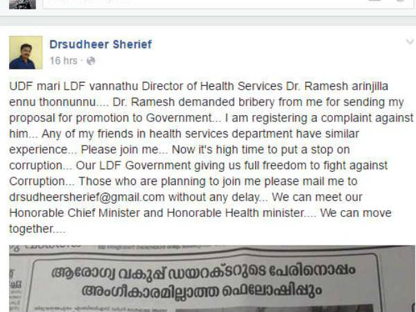 ആരോഗ്യവകുപ്പ് ഡയറക്ടറുടെ അഴിമതിക്കെതിരെ തെളിവുണ്ടെങ്കില് അറിയിക്കണമെന്നാവശ്യപ്പെട്ട് തന്റെ ഇ മെയില് അഡ്രസും നല്കിയാണ് സുധീര് ഫേസ് ബുക്ക് പോസ്റ്റ് അവസാനിപ്പിക്കുന്നത്.