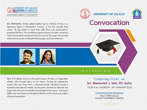 മോഹന്ലാലിനും പിടി ഉഷക്കും ഇന്ന് കാലിക്കറ്റ് സര്വകലാശാല ഡി ലിറ്റ് സമ്മാനിക്കും