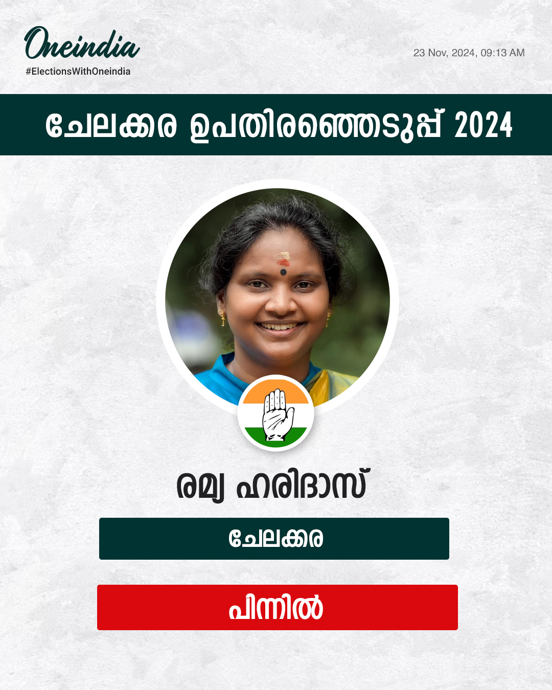ചേലക്കരയില് രമ്യ ഹരിദാസിന്റെ സാധ്യത കുറഞ്ഞു.