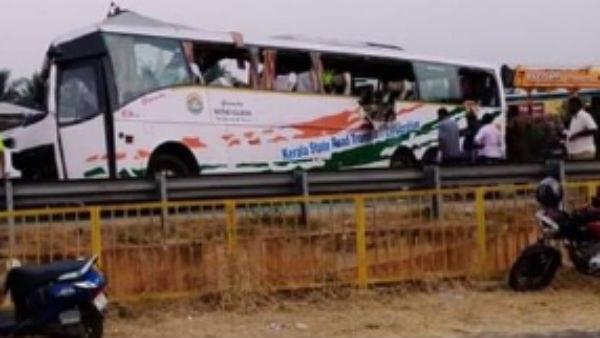 അപകടത്തില് 21 പേര്ക്കാണ് പരിക്കേറ്റത്. അതേസമയം പരിക്കേറ്റ രണ്ട് പേരുടെ നില ഗുരുതരമാണെന്നാണ് വിവരം. ഇന്ന് പുലര്ച്ചെ 3.25 നാണ് അകടമുണ്ടായത്. ഡിവൈഡറില് ഇടിച്ച് നിരതെറ്റിയ കണ്ടെയ്നര് ലോറി എതിര് വശത്ത് കൂടി വരികയായിരുന്ന ബസ്സില് ഇടിക്കുകയായിരുന്നു. ലോറിയില് അമിത ഭാരം കയറ്റിയതായും റിപ്പോര്ട്ടുണ്ട്.