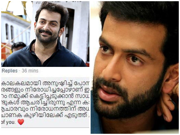 ഇതോടെ പൃഥ്വിക്കെതിരെ ഒരുകൂട്ടം സോഷ്യല് മീഡിയയില് രംഗത്തെത്തി കഴിഞ്ഞു.പൃഥ്വിയില് നിന്ന് ഇത്തരത്തില് ഒരിക്കലും പ്രതീക്ഷിച്ചില്ലെന്നായിരുന്നു ചിലര് ഫേസ്ബുക്കില് കുറിച്ചത്. നിലപാടിലെ മലക്കം മറിച്ചലിനെതിരെ നടന്റെ ഫേസ്ബുക്ക് പേജിലും ചിലര് പൊങ്കാല നടത്തുകയാണ്.
