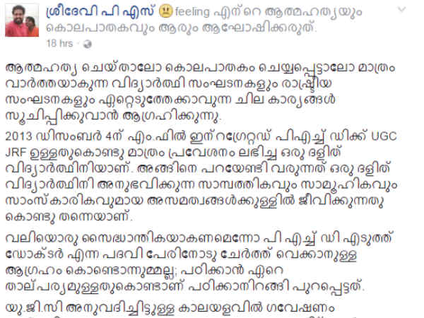 കാലടി സംസ്കൃത സര്വ്വകലാശാലയിലെ ഗവേ,ണ വിദ്യാര്ത്ഥി ശ്രീദേവി പിഎസിന്റെ ഫേസ്ബുക്ക് പോസ്റ്റ് വായിച്ചാല് കാര്യങ്ങള് കുറച്ച് കൂടി വ്യക്തമാകും. തന്റെ ആത്മഹത്യയും കൊലപാതകവും ആരും ആഘോഷിക്കരുത് എന്ന് പറഞ്ഞാണ് ശ്രീദേവ് ആ കുറിപ്പ് തന്റെ ഫേസ്ബുക്ക് വാളില് ഇട്ടത്.
