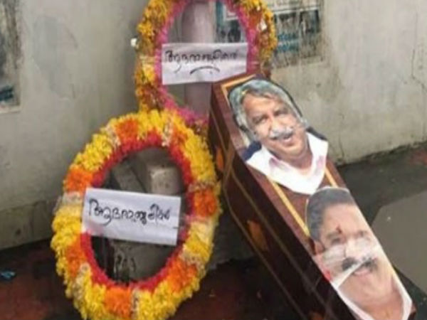 എഐസിസി ജനറൽ സെക്രട്ടറി ഉമ്മൻ ചാണ്ടി, പ്രതിപക്ഷ നേതാവ് രമേശ് ചെന്നിത്തല എന്നിവരുടെ ഫോട്ടൊകളും റീത്തകളും വച്ച ശവപ്പെട്ടിയാണ് ഡിസിസി ഓഫിസിനു മുന്നിലെ കൊടിമരത്തിന് സമീപം ഞായറാഴ്ച രാവിലെ കാണപ്പെട്ടത്. പ്രവർത്തകരുടെ മനസിൽ ഇവർ മരിച്ചു പോയതായി ഡിസിസി ഓഫിസിൽ പോസ്റ്ററും പതിക്കുകയും കൊടിമരത്തിൽ കറുത്ത കൊടി പാതി ഉയർത്തുകയും ചെയ്തിരുന്നു.