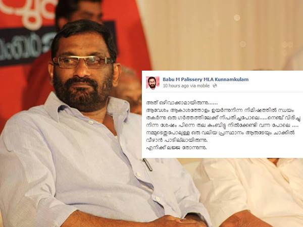 'അത് ഒഴിവാക്കാമായിരുന്നു. ആവേശം ആകാശത്തോളം ഉയര്ന്നുനിന്ന നിമിഷത്തില് സ്വയം തകര്ന്നു ഒരു ഗര്ത്തത്തിലേക്ക് നിലംപതിച്ചപോലെയായി. നെഞ്ച് വിരിച്ചു നിന്ന ശേഷം പിന്നെ തല കുമ്പിട്ടു നില്ക്കേണ്ടി വന്ന പോലെ. നമ്മുടെതുപോലുള്ള ഒരു വലിയ പ്രസ്ഥാനം ആരുടേയും ചാക്കില് വീഴാന് പാടില്ലായിരുന്നു. എനിക്ക് ലജ്ജ തോന്നുന്നു'. പാലിശ്ശേരി തന്റെ ഫേസ്ബുക്കില് കുറിച്ചു.