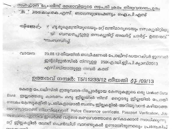 മുഖ്യമന്ത്രിയുടെയും മന്ത്രിമാരുടെയും സുരക്ഷയുമായി ബന്ധപ്പെട്ട സെക്യൂരിറ്റി അലെര്ട്ട് ചാര്ട്ട് തയാറാക്കുന്നതുമായി ബന്ധപ്പെട്ടാണ് സര്ക്കുലര് തയ്യാറാക്കിയത്. ഇന്റലിജന്സ് എഡിജിപി ടിപി സെന്കുമാറിന്റെ കത്തിന്റെ അടിസ്ഥാനത്തിലായിരുന്നു ഇത്. 2013 സെപ്റ്റംബര് ഏഴിനായിരുന്നു ഡിജിപി കെഎസ് ബാലസുബ്രമണ്യം സര്ക്കുലര് പുറത്തിറങ്ങിയത്.