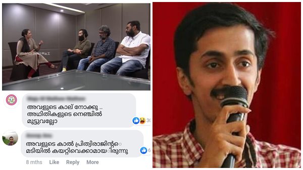 അതിൽ കൃത്യമായി അവതാരകയെത്തന്നെ തിരഞ്ഞിട്ട് ആക്രമിക്കുന്നത് നോക്ക്യേ. അതെന്ത്... പൃഥ്വിരാജ് ബഹുമാനം കാണിക്കേണ്ടേ? കുറച്ച് മനുഷ്യർ അവർക്ക് കംഫർട്ടബിളായ പൊസിഷനിൽ ഇരുന്ന് വർത്തമാനം പറയുന്നു. ആ ഇരിക്കുന്നത് നിങ്ങടെ വീടിനകത്ത് നിങ്ങടെ പ്രൈവസിക്ക് വിഘാതമായിരിക്കുമ്പൊഴോ അല്ലെങ്കിൽ ആ കാലിരിക്കുന്നത് നിങ്ങടെ നെഞ്ചത്തോ ആവാത്തിടത്തോളം നിങ്ങക്കെന്ത് തേങ്ങയാണ് ഇത്ര കുരു പൊട്ടാൻ ഹേ?''