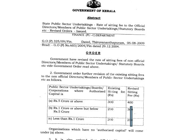 ഇതിന്റെ മുന് ഉത്തരവായ G.O.(P) No. 325/2009/Fin dated 06.08.2009 പ്രകാരം അഞ്ചുകോടിക്കു മുകളില് വരുമാനമുള്ള സ്ഥാപനങ്ങള്ക്ക് 400 രൂപയും, ഒരുകോടി മുതല് അഞ്ചു കോടിവരെ വരുമാനമുള്ളവയ്ക്ക് 300ഉം, ഒരുകോടിയില് താഴെ വരുമാനമുള്ളവര്ക്ക് 250 രൂപയുമായി സിറ്റിംഗ് ഫീസ് പുതുക്കി നിശ്ചയിച്ചിരുന്നു.
