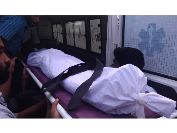 മരിച്ച കുട്ടികളുടെ മൃതദേഹം ശമശാനത്തിലേക്ക് കൊണ്ടുപോകാനായി ആംബുലന്സില് നിന്ന് ഇറക്കുന്നു.