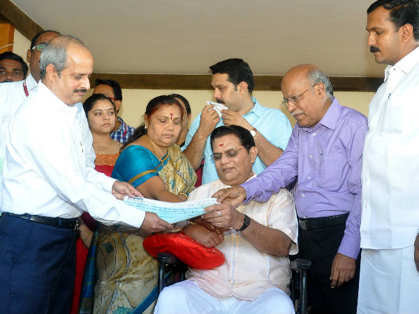 ജഗതിയ്ക്ക് നഷ്ടപരിഹാരത്തുകയുടെ ചെക്ക് കൈമാറുന്നു
