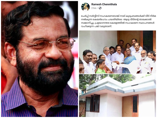 പ്രളയശേഷം കേരളത്തെ വീണ്ടെടുക്കാൻ സർക്കാർ ഒന്നും ചെയ്യുന്നില്ലെന്ന ചെന്നിത്തലയുടെ വിമർശനത്തിന് പിന്നാലെയാണ് സഹകരണ വകുപ്പ് ആവിഷ്കരിച്ച് നടപ്പിലാക്കുന്ന കെയർ ഹോം പദ്ധതിയുടെ കീഴിൽ ചേർപ്പ് സഹകരണ സംഘം നിർമ്മിച്ച വീടിന്റെ താക്കോൽദാനം നിര്വഹിക്കുന്ന രമേശ് ചെന്നിത്തലയുടെ ചിത്രവും ചടങ്ങിന്റെ വാർത്തയും കടകംപളളി സുരേന്ദ്രൻ ഫേസ്ബുക്കിൽ പങ്കുവെച്ചത്. ഇനിയും ഇതുപോലെ താക്കോൽ ദാനം നടത്താൻ ചെന്നിത്തലയ്ക്ക് കഴിയട്ടെയെന്ന് മന്ത്രി പറയുന്നു. കൂടാതെ പ്രളയ പുനർനിർമാണത്തിനായി സർക്കാർ നടപ്പിലാക്കിയ പ്രവർത്തനങ്ങൾ എണ്ണമിട്ട് നിരത്തുകയും ചെയ്യുന്നുണ്ട് മന്ത്രി,