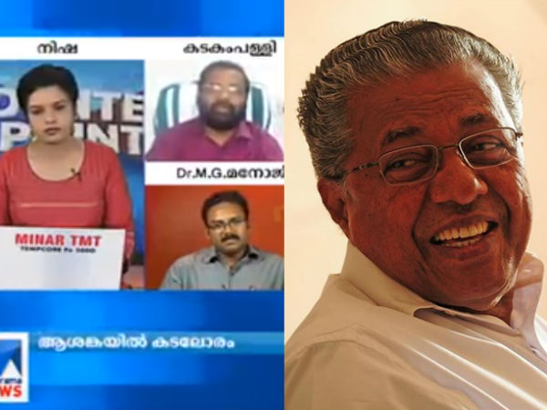 ഓഖി ചുഴലിക്കാറ്റ് കേരളതീരങ്ങളില് ദുരന്തം വിതയ്ക്കുന്നതിനെക്കുറിച്ചാണ് കഴിഞ്ഞ ദിവസം മനോരമ ന്യൂസ് ചാനല് ചര്ച്ച സംഘടിപ്പിച്ചത്. രക്ഷാ പ്രവര്ത്തനങ്ങള് ഏകോപിക്കുന്നതില് വന്ന വീഴ്ചകളും മുഖ്യമന്ത്രി പിണറായി വിജയന് ദുരിതബാധിത മേഖല സന്ദര്ശിക്കാത്തതുമൊക്കെയായിരുന്നു ചര്ച്ചയുടെ കേന്ദ്രബിന്ദു. സര്ക്കാരിനെ പ്രതിനിധീകരിച്ച് മന്ത്രി കടകംപള്ളി സുരേന്ദ്രനാണ് ചര്ച്ചയില് പങ്കെടുത്തത്.