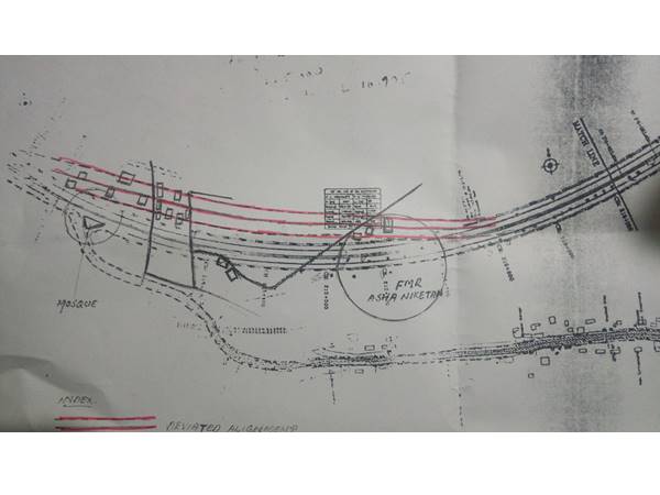 പ്ലാനിലെ കറുപ്പ് വര പഴയ അലൈന്മെന്റ്, ചുവപ്പുവര പുതുതായി വരച്ച അലൈന്മെന്റ്.