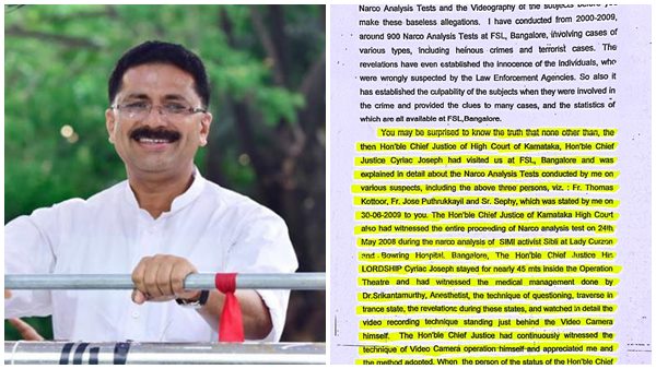 "കർണാടക ഹൈക്കോടതിയിലെ ബഹുമാനപ്പെട്ട ചീഫ് ജസ്റ്റിസ് സിറിയക് ജോസഫല്ലാതെ മറ്റാരുമല്ല ബാംഗ്ലൂർ എഫ്എസ്എല്ലിൽ ഞങ്ങളെ സന്ദർശിച്ചത്. കുറ്റക്കാരെന്ന് സംശയിക്കപ്പെട്ട മൂന്നുപേർ ഉൾപ്പെടെയുള്ളവരിൽ (അതായത് ഫാ. തോമസ് കോട്ടൂർ, ഫാ. ജോസ് പൂതൃക്കയിൽ, സിസ്റ്റർ സ്റ്റെഫി) ഞാൻ നടത്തിയ നാർക്കോ അനാലിസിസിന്റെ വിശദാംശങ്ങൾ അദ്ദേഹത്തിന് വിവരിച്ചു കൊടുത്തിരുന്നുവെന്ന സത്യം താങ്കളിൽ ആശ്ചര്യമുളവാക്കിയേക്കാം. ഇത് 30.06.2009ന് ഞാൻ താങ്കൾക്ക് നൽകിയ മൊഴിയിലുണ്ട്".
