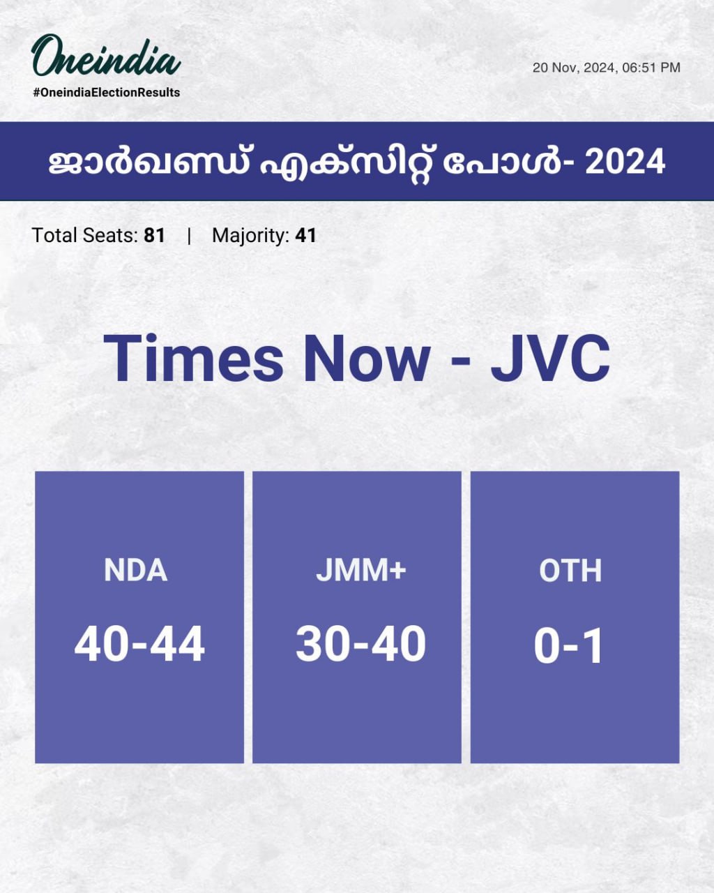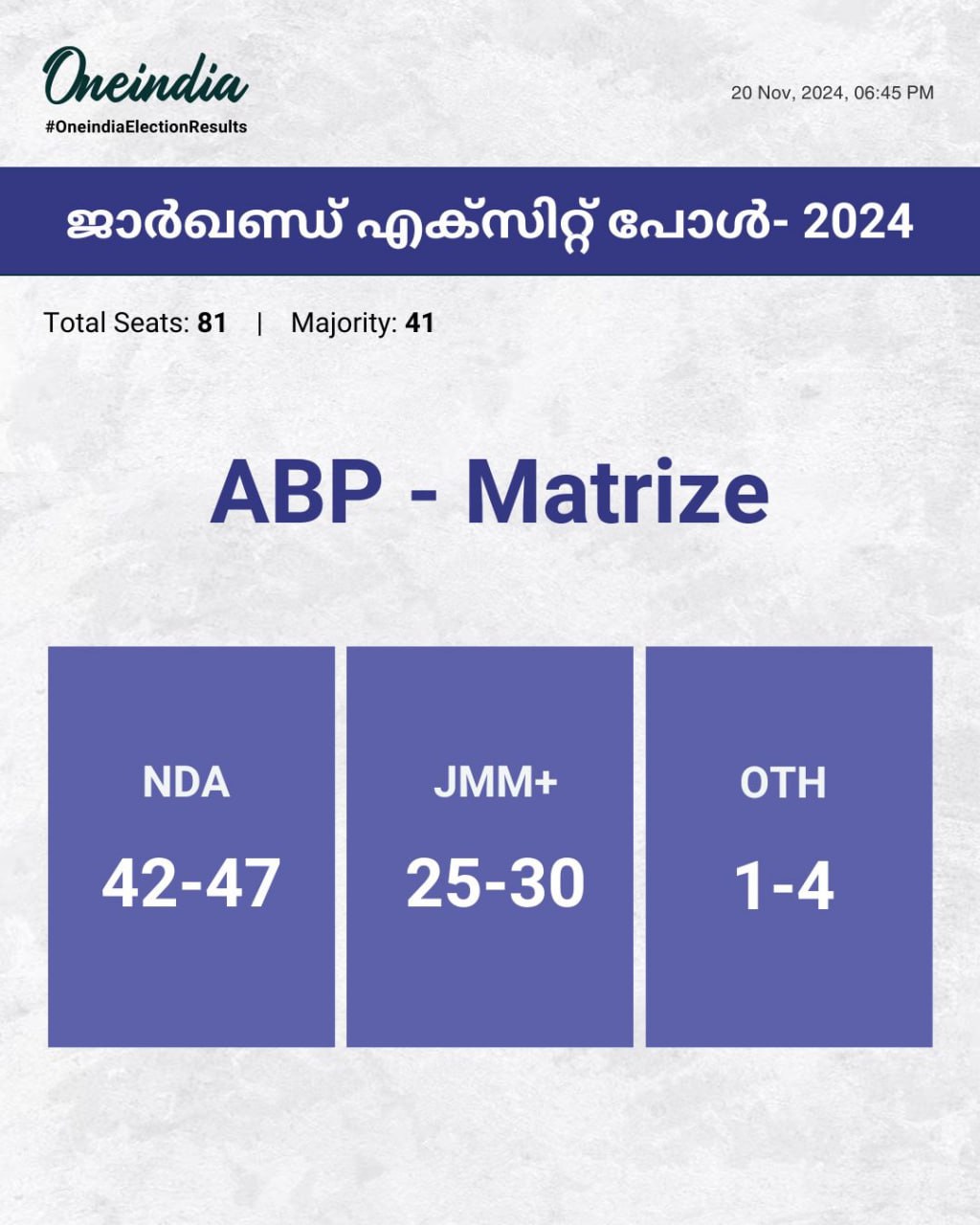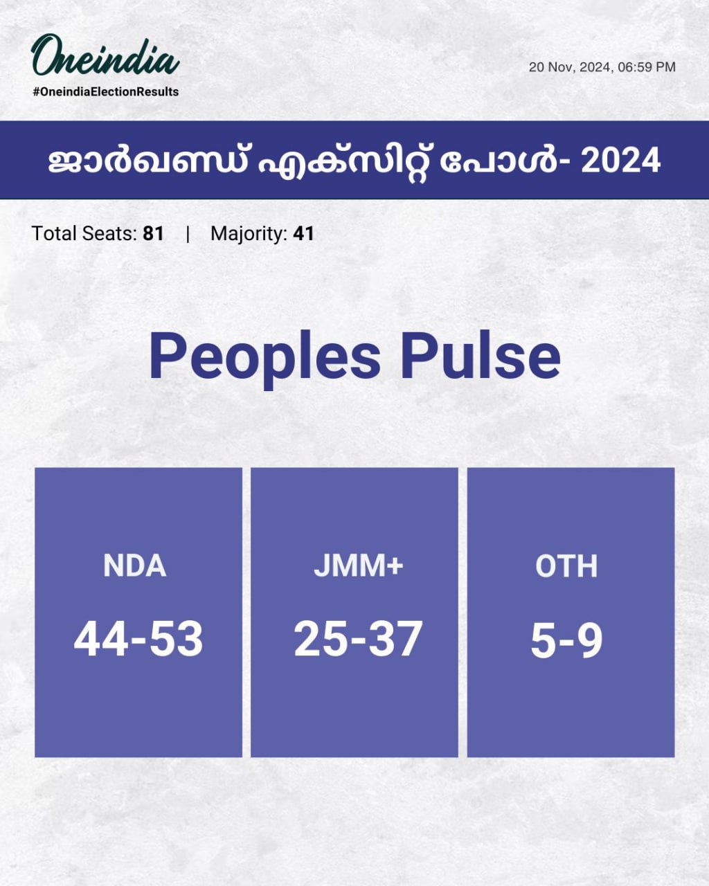 ജാർഖണ്ഡിൽ ഇന്ത്യാ സഖ്യം വിജയിക്കുമെന്ന് ആക്സിസ് മൈ ഇന്ത്യ എക്സിറ്റ് പോൾ. ഇന്ത്യാ സഖ്യത്തിന് 52 സീറ്റുകളെ വരെ ലഭിക്കും