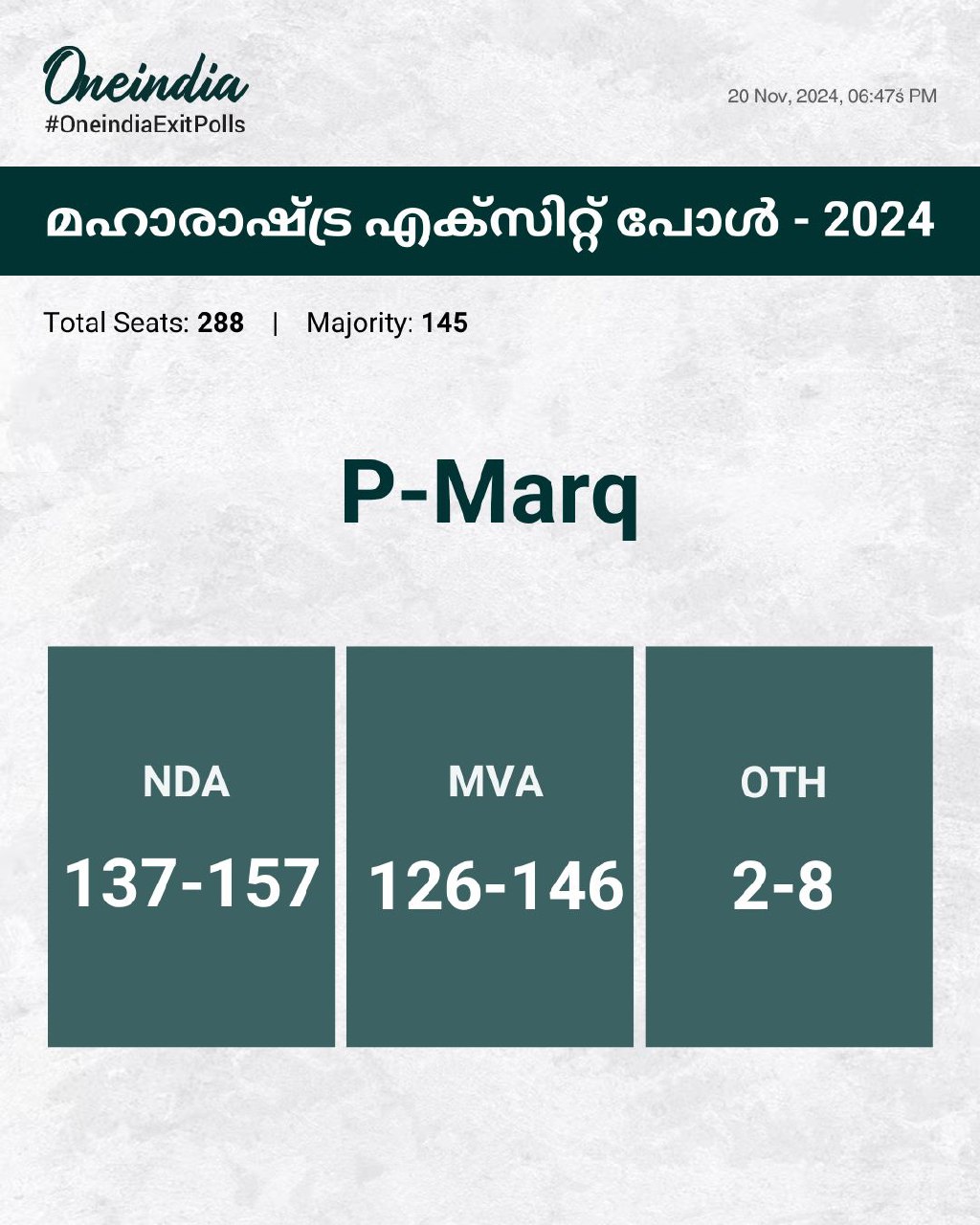മഹാരാഷ്ട്രയില് എന് ഡി എ 137 - 157 സീറ്റുകള് വരെ നേടുമെന്ന് റിപബ്ലിക് പി മാര്ക്ക് എക്സിറ്റ് പോള്. എം വി എയ്ക്ക് 126- മുതല് 164 സീറ്റ് വരെയാണ് പ്രവചിച്ചിരിക്കുന്നത്