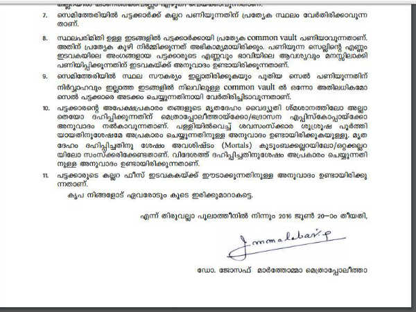സെമിത്തേരിയില് സ്ഥല സൗകര്യം ഇല്ലാത്തും ശ്മശാനങ്ങള് നിര്മ്മിക്കാന് പറ്റാത്തതും വലിയ പ്രതിസന്ധിയാണ്. അതുകൊണ്ട് പള്ളിയില് സവസംസ്കാര ശുശ്രൂഷകള് പൂര്ത്തിയാക്കിയതിന് ശേഷം മൃതദേഹം ദഹിപ്പിക്കാം. പക്ഷേ ദഹിപ്പിച്ചതിന് ശേഷം അവശിഷ്ടം കുടുംബകല്ലറയിലേ ഒറ്റകല്ലറയിലോ അടക്കം ചെയ്യണമെന്നും സര്ക്കുലറില് പറയുന്നു. വിദേശത്ത് വച്ച് മരണപ്പെടുന്നവര്ക്കും ഇത് ബാധകമാണെന്നും സര്ക്കുലറില് വ്യക്തമാക്കുന്നു.