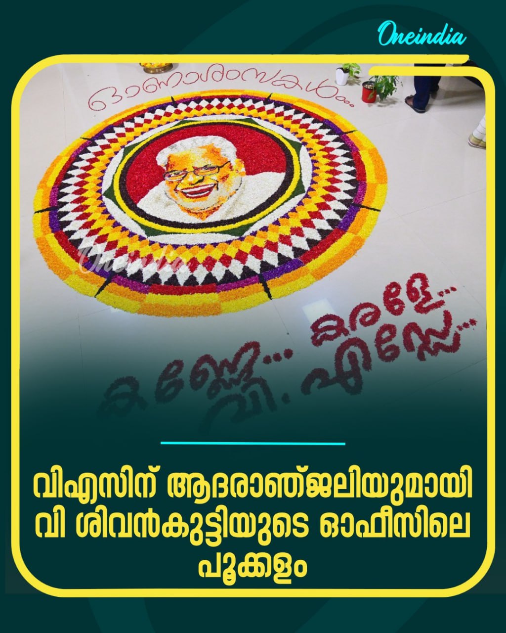 മുൻ മുഖ്യമന്ത്രിയും സി.പി.എം. പോളിറ്റ് ബ്യൂറോ അംഗവുമായിരുന്ന വി.എസ്. അച്യുതാനന്ദന്റെ ചിത്രം വരച്ച് പൂക്കളം തീർത്ത് പൊതുവിദ്യാഭ്യാസവും തൊഴിലും വകുപ്പ് മന്ത്രി വി. ശിവൻകുട്ടിയുടെ ഓഫീസിലെ ജീവനക്കാർ. അന്തരിച്ച നേതാവിനുള്ള ആദരാഞ്ജലിയായിട്ടാണ് അദ്ദേഹത്തിന്റെ ചിത്രം പൂക്കളമായി ഒരുക്കിയത്. വി.എസ്. ഇല്ലാത്ത ആദ്യ ഓണമാണിത്.