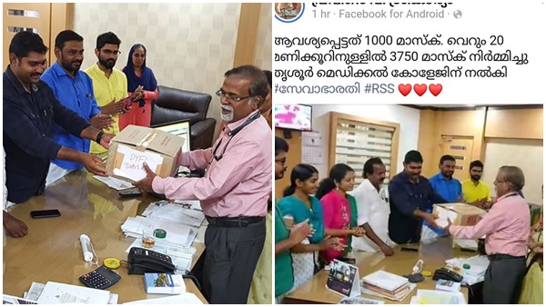 'ഡിവൈഎഫ്ഐ വിതരണം ചെയ്ത മാസ്കുകള് ഫേസ്ബുക്കിലെത്തിയപ്പോള് സേവാഭാരതിയുടേതായി, മറിമായം'