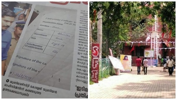 തിരുവനന്തപുരം: യൂണിവേഴ്സിറ്റ് കോളേജിലെ യൂണിയന് ഒഫീസില് നിന്ന് കണ്ടെടുത്ത ആര്ട്സ് ഫെസ്റ്റിന്റെ രജിസ്ട്രേഷന് ഫോം ഉത്തരക്കടലാസായി ചിത്രീകരിച്ച് മാതൃഭൂമി വാര്ത്ത. ഇന്ന് പുറത്തിറങ്ങിയ മാതൃഭൂമിയുടെ എല്ലാ എഡിഷനിലേയും ഒന്നാംപേജിലെ പ്രധാന വാര്ത്തയോടൊപ്പമാണ് യൂണിവേഴ്സിറ്റി കോളേജിലെ യൂണിയന് റുമില് നിന്ന് പിടിച്ചെടുത്ത ഉത്തരക്കടലാസുകള് എന്ന അടിക്കുറിപ്പോടെ ആര്ട്സ് ഫെസ്റ്റിന്റെ രജിസ്ട്രേഷന് ഫോമിന്റെ ചിത്രം ഉള്പ്പെടുത്തിയിരിക്കുന്നത്.