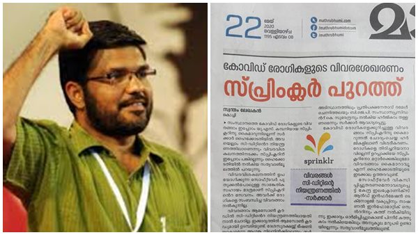മുഖ്യമന്ത്രി പത്ര സമ്മേളനത്തിലും ഐ .ടി .വകുപ്പ് പത്രക്കുറിപ്പായും കഴിഞ്ഞ തവണ കോടതിയിലും പറഞ്ഞതല്ലേ ഇന്നലെ കോടതിയിൽ ആവർത്തിച്ചത്? എന്നിട്ടും ജനങ്ങളെ ബോധപുർവ്വം തെറ്റിദ്ധരിപ്പിക്കുന്ന മാതൃഭൂമിയുടെ അജണ്ട വ്യക്തമല്ലേ. സ്പ്രിങ്ക്ളർ മരുന്നു കമ്പനിയായ ഫൈസറിന് ഡേറ്റ വിറ്റു എന്ന കള്ള വാർത്ത കൊടുത്ത് ഒരു മണിക്കൂർ തികയും മുമ്പ് വാർത്ത പിൻവലിച്ച് ഓടിയ നാണക്കേടിൽ നിന്ന് മാതൃഭൂമി എന്തെങ്കിലും പാഠം പഠിച്ചോ''?
