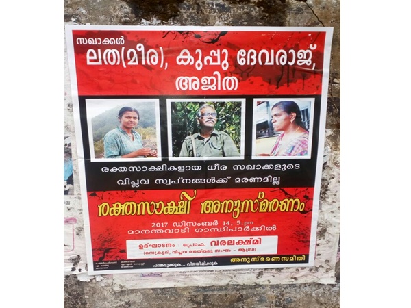 ആന്ധ്രയിലെ വിപ്ലവ രജയ്തലു സംഘം സെക്രട്ടറി പ്രൊഫ.വരലക്ഷ്മിയാണ് ഉദ്ഘാടനം ചെയ്യുക എന്നും കുറിച്ചിട്ടുണ്ട്. അനുസ്മരണ സമിതിയുടെ പേരിലാണ് പോസ്റ്റര്. കഴിഞ്ഞ നവംബര് 24-നാണ് നിലമ്പൂര് ഉള്വനത്തിലെ വരയന് മലയുടെ താഴ്വാരത്തില് പോലീസിന്റെ വെടിയേറ്റ് മാവോയിസ്റ്റ് കേന്ദ്രക്കമ്മിറ്റി അംഗം കുപ്പുദേവരാജും സംസ്ഥാന നേതാവ് അജിതയും വെടിയേറ്റ് മരിച്ചത്. കാട്ടാനയുടെ ആക്രമണത്തില് ലത(മീര)യും മരിച്ചതായി പിന്നീട് മാവോയിസ്റ്റുകള് തന്നെ അറിയിച്ചിരുന്നു.