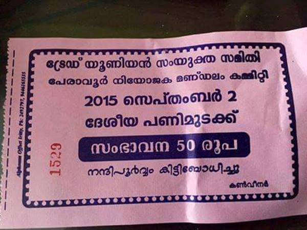 ദേശീയ പണിമുടക്കിന് സംഭാവന പിരിച്ചു എന്ന് പറയുന്ന രസീതിക്ക് ക്യാപ്ഷന് പിന്നെ ഇതിനൊക്കെ ചെലവില്ലേ എന്നാണ്.