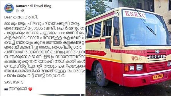 എന്നാൽ ഇപ്പോഴിതാ സ്വകാര്യ ബസ് ജീവനക്കാരന്റെ കുറിപ്പിന് മറുപടിയുമായി മറ്റൊരു കുറിപ്പാണ് ഇപ്പോൾ പ്രചരിക്കുന്നത്. കെഎസ്ആര്ടിസിയുടെ വിവിധ പേജുകളിലടക്കം പ്രചരിക്കുന്ന കുറിപ്പ് ആരാണ് എഴുതിയതെന്ന് വ്യക്തമല്ല. ആ 800 രൂപയും ചെലവും ബത്തയും കൂട്ടിയാലും ഞങ്ങളുടെ ശമ്പളം കുറവാണെന്നാണ് പോസ്റ്റിലെ ഉള്ളടക്കം, വായിക്കാം